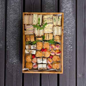 Sandwich platters come with a mix of meat and vegetarian sandwiches, sausage rolls/vegetable bites, crisps, and a selection of fruit and cakes.